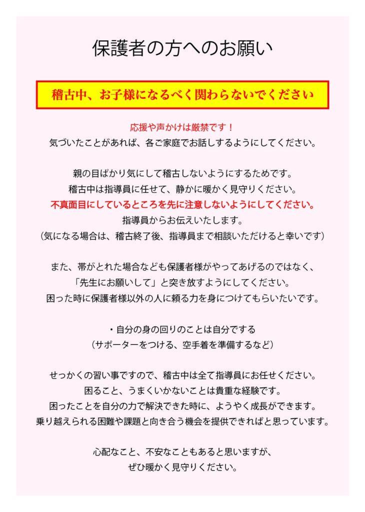 3)稽古開始 保護者様も見学いただけます。見学なしでも大丈夫です。 空手着不要です。運動できる服装でご参加いただけます。 飲み物、タオルなどをご持参ください。